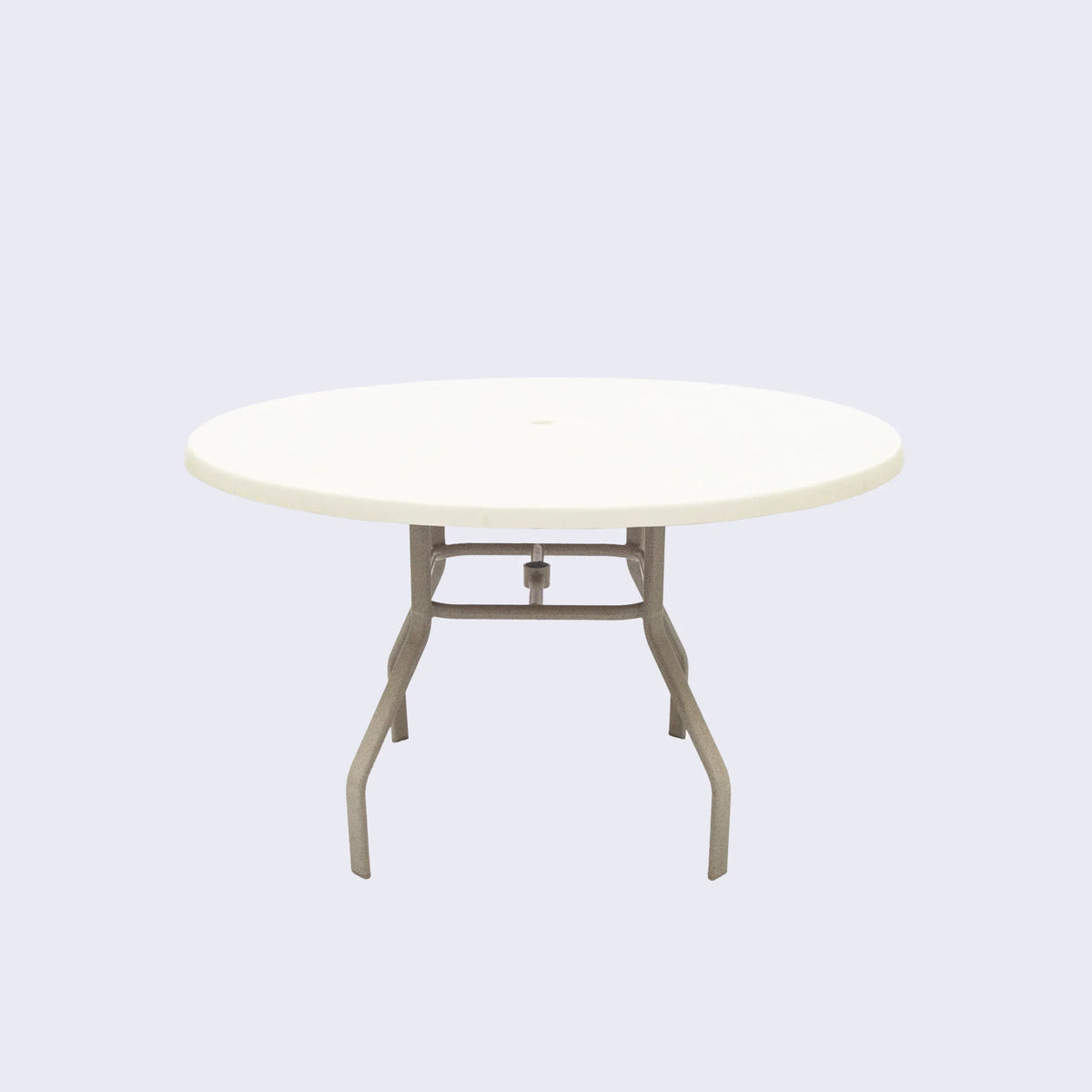 The Round Fiberglass Patio Table is a commercial grade table made for outdoor use. The table features classic styling and a round, 36" inch tabletop that can comfortably seat up to 4. The acrylic top has a beautiful, hammered finish that is shatter and sun resistant. The base of the A36 Round Patio Dining Table is crafted from 1" round extruded aluminum tubing.The frame may be powder-coated in any frame finish of your choice and is available with or without an umbrella hole. Create your own outdoor furniture set when you pair this commercial outdoor table with any dining chair.