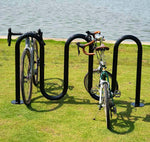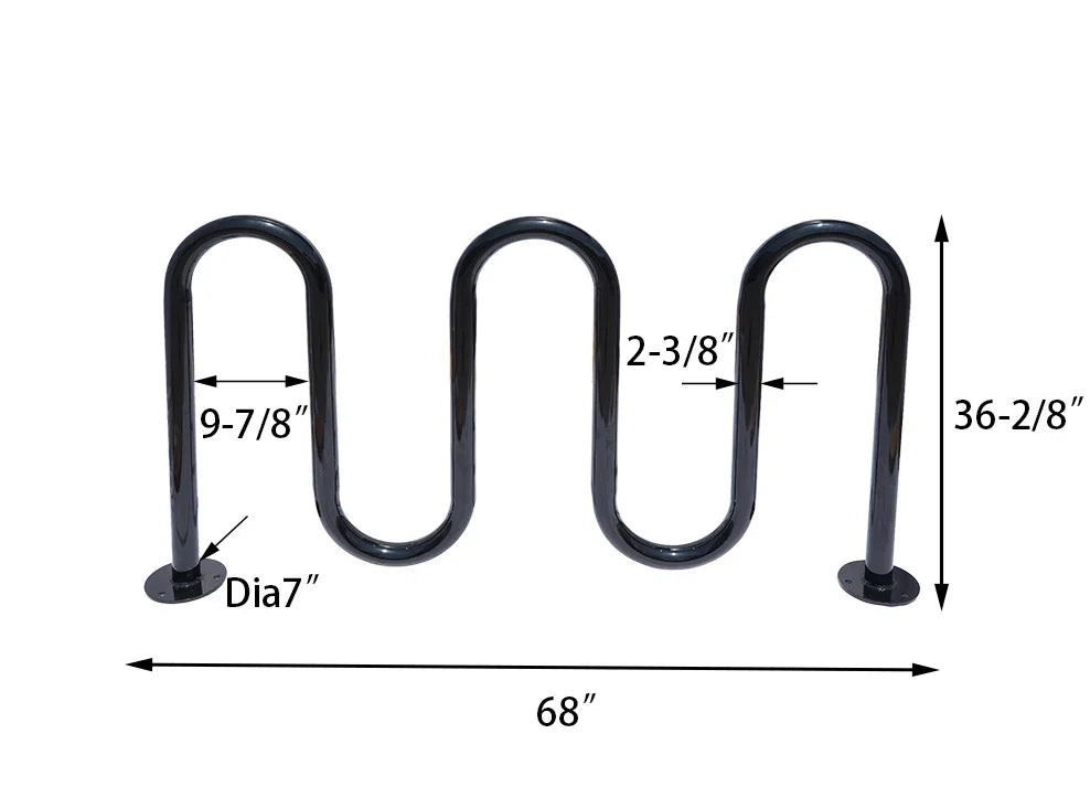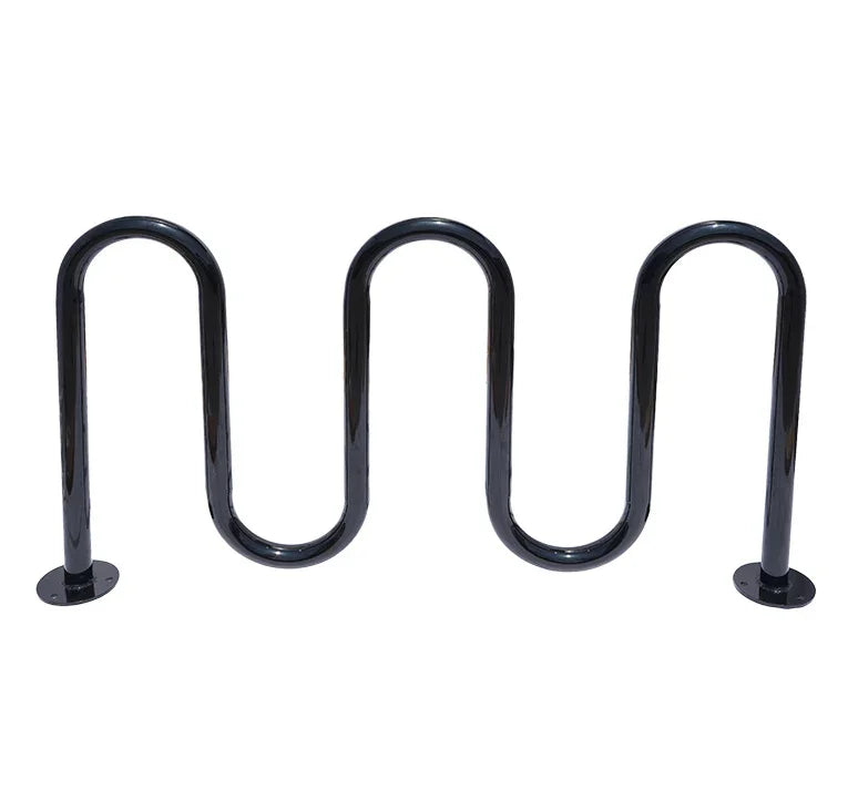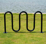 The Rolling Bike rack is where modern meets simplicity.  Functional yet aesthetically pleasing these rack provides security, stability and two-way parking access for multiple bikes.  The wave pattern is adequately spaced to allow easy pull-in parking, supporting just about every type of bicycle and popular bike locks.
