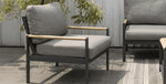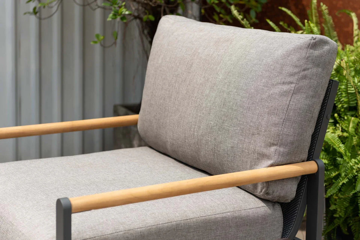 3-seater deep seating outdoor sofa in rust-free sanded dark grey aluminum frames with Teak accents and premium Olefin cushions.