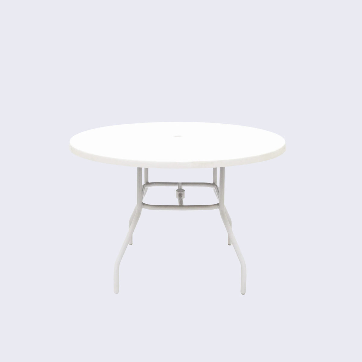 The Round Fiberglass Patio Table is a commercial grade table made for outdoor use. The table features classic styling and a round, 42" inch tabletop that can comfortably seat up to 4. The Fiberglass top has a beautiful, smooth finish that is durable and sun resistant. The base of the Round Patio Dining Table is crafted from 1" round extruded aluminum tubing.The frame may be powder-coated in any frame finish of your choice and is available with or without an umbrella hole. Create your own outdoor furniture set when you pair this commercial outdoor table with any dining chair.