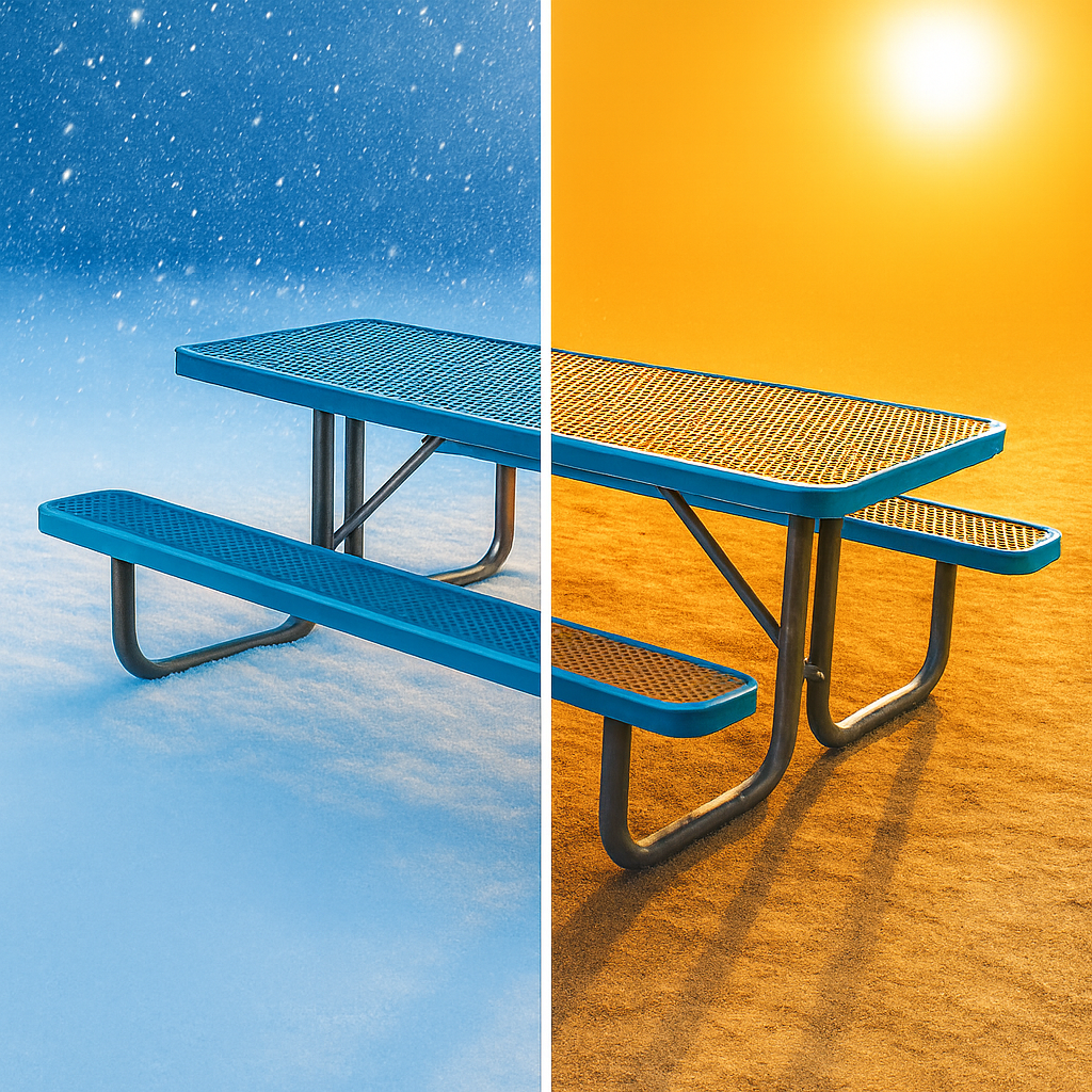 Our commercial picnic tables are all-weather designs engineered to outlast every season—sun, rain, or snow. Built from durable materials and finished with long-lasting thermoplastic coating.